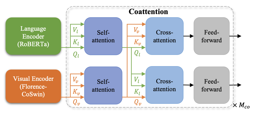 共同注意力模型可以将文本和视觉特征分别送入两个Transformer,每个Transformer的顶层编码层包括一个自注意力块、一个交叉注意力块和一个前馈网络块。