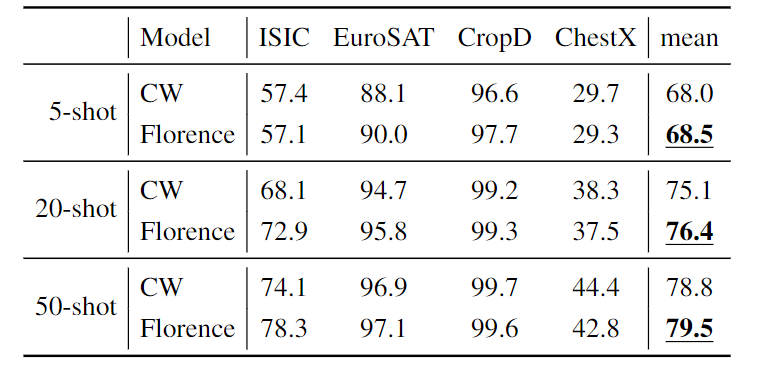 评估包括5-shot、20-shot和50-shot的5-way分类。为了预测类别,研究人员将一个单层线性层作为CoSwin图像编码器的adapter head。