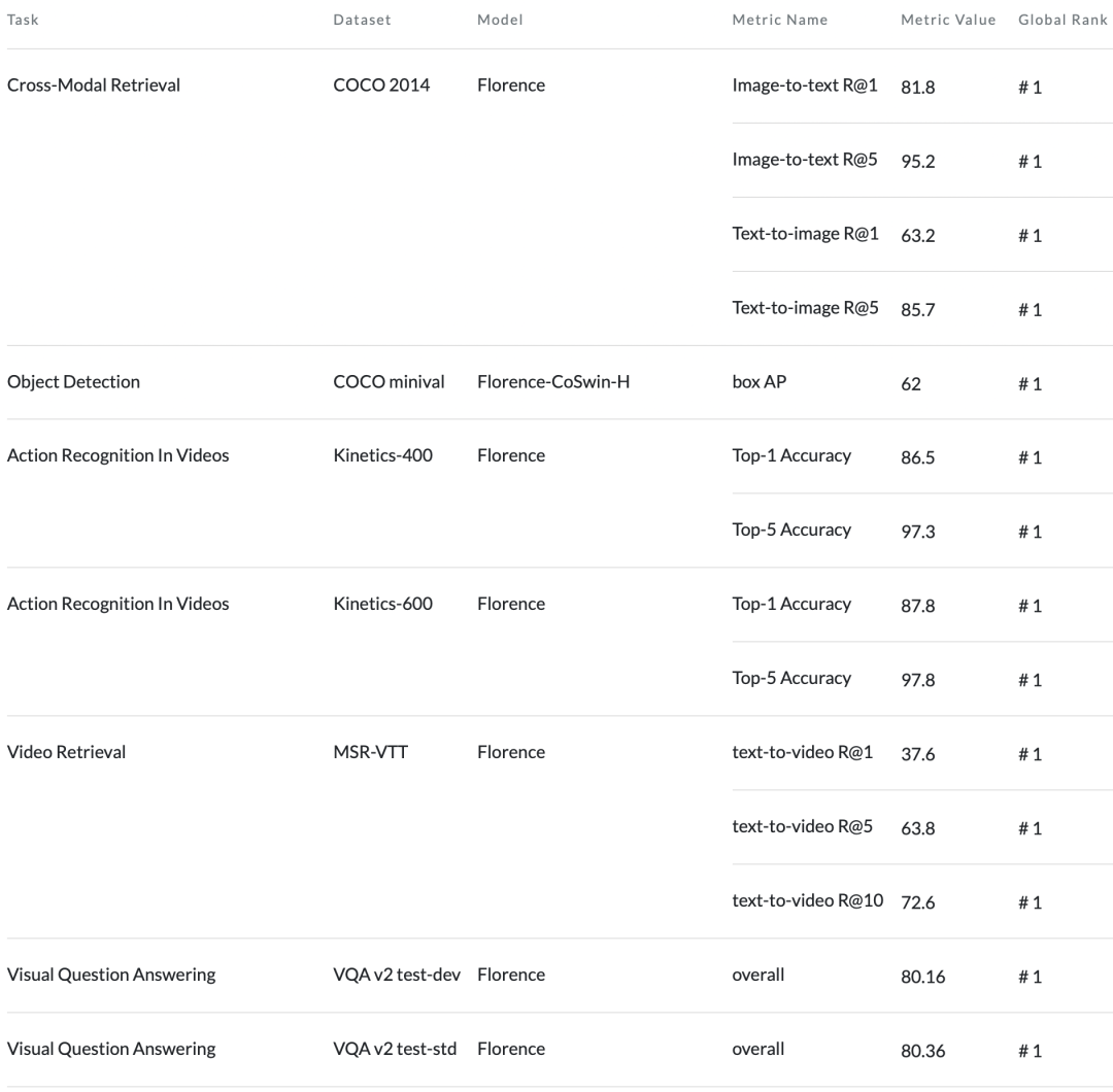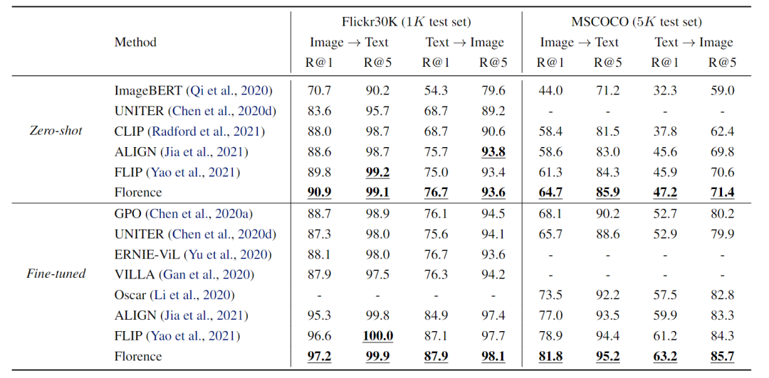 Florence的性能优于之前在两个数据集上取得的所有结果。