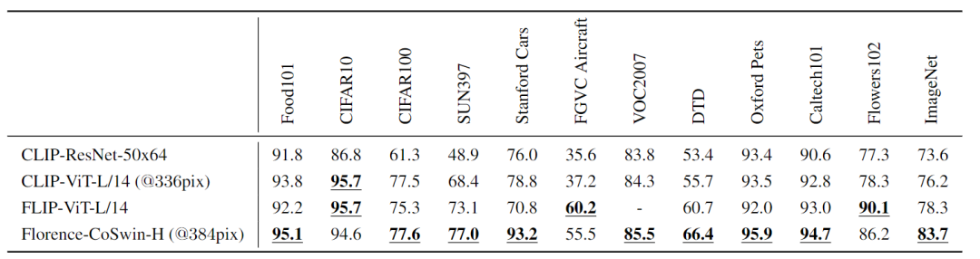 实验部分遵循CLIP的设置,对于每个数据集,使用数据集中所有类的名称作为潜在文本对集,并使用Florence预测的最可能的「图像、文本」对。