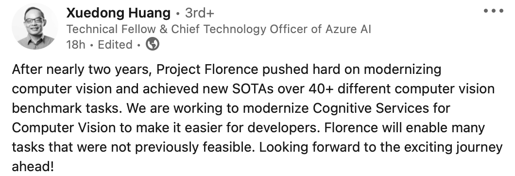 微软Azure AI首席技术官黄学东(Xuedong Huang)也发文称赞这一工作: