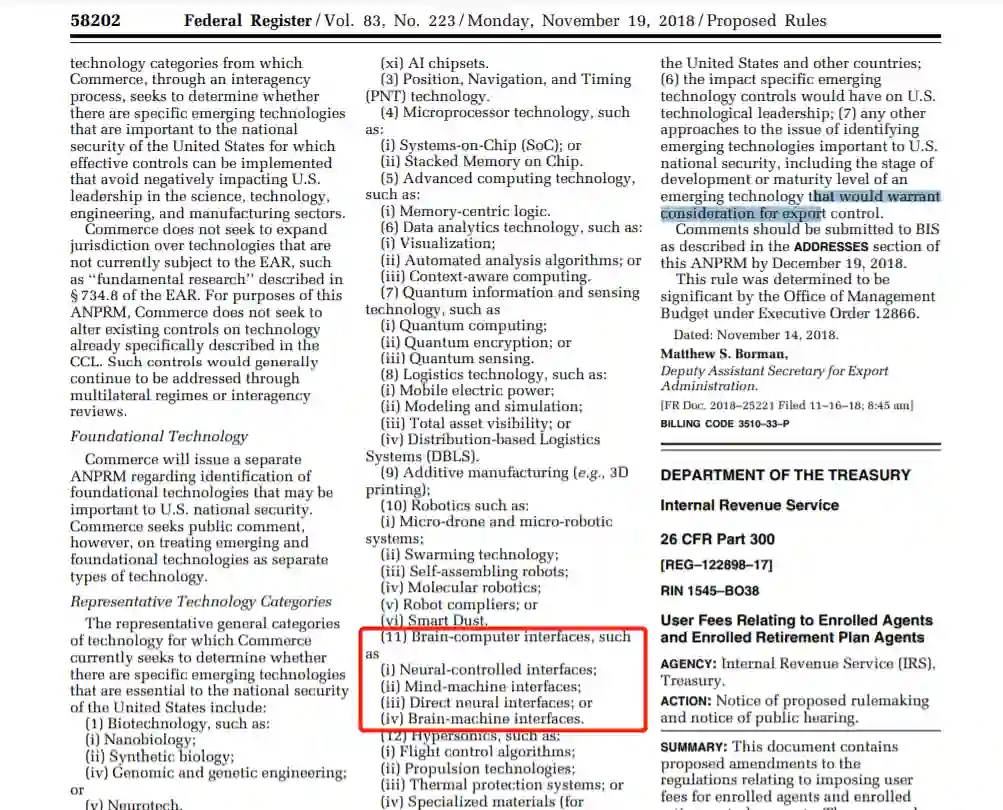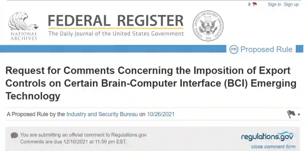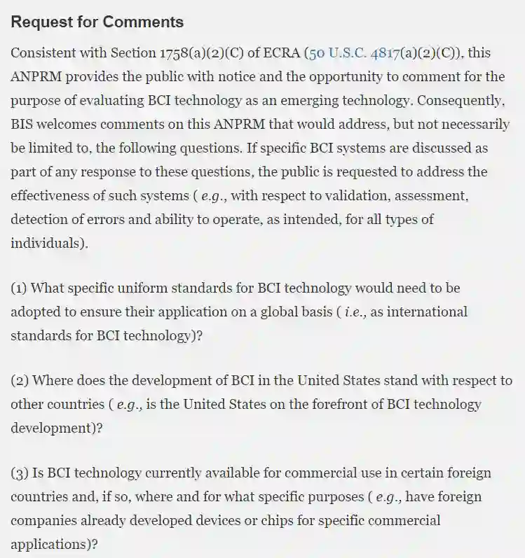 BIS 表示,正在就脑机接口技术的潜在用途征求公众意见,尤其是这类技术对美国国家安全的影响,(比如,此类技术是否可以为美国或其任何对手提供军事或情报优势)。