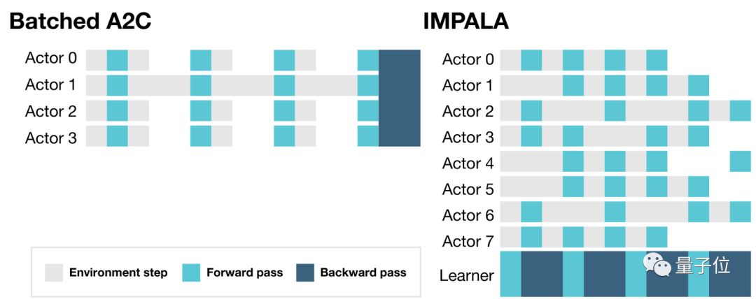 不过操作和学习的解耦也导致,actor的策略落后于learner。为了弥补这样的差距,我们引入了离策略优势actor-评价者公式V-trace。它弥补了离策略actor获得的轨迹。你可以从我们的论文中了解算法及其分析细节。