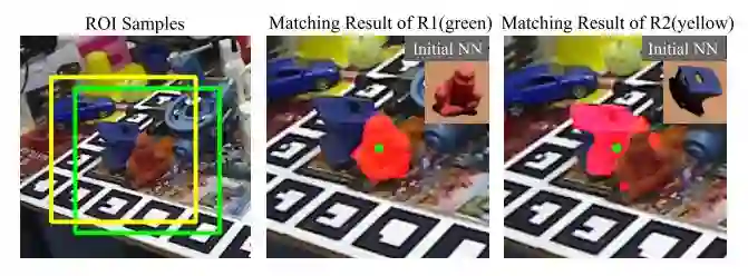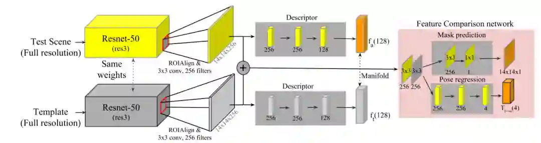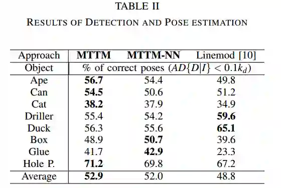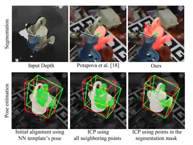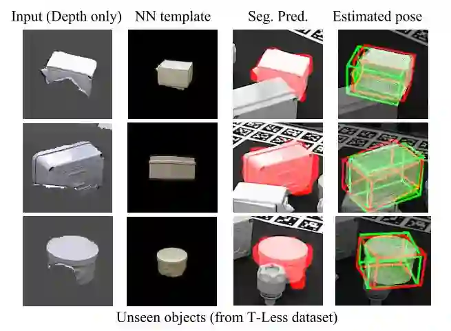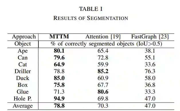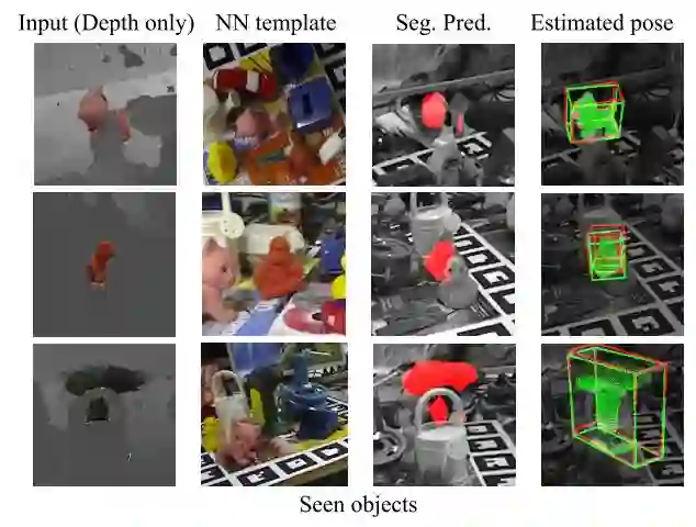 在有限数量的样本下,模板匹配可以准确估计新对象的姿态。然而,估计被遮挡物的位姿仍然是一件具有挑战性的事。此外,深度图像比彩色图像更适合应用于机器人领域常见的无纹理对象情况。在这篇文章中,我们提出了一种新的框架,多任务模板匹配(MTTM),它可以在使用对象区域的相同特征图预测分割掩码和场景中检测到的对象与模板之间的位姿转换时,从深度图像中找到目标对象最近的模板。提出的特征比较网络通过比较模板的特征图和场景的剪切特征来计算分割掩码和位姿预测。该网络的分割结果通过排除不属于该对象的点,提高了位姿估计的鲁棒性。实验结果表明,尽管仅使用深度图像,MTTM的结果仍优于基线方法对被遮挡对象进行分割和位姿估计。