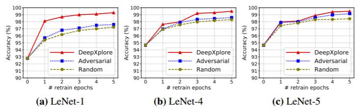 图 9:当训练数据集使用了同样数量的输入(分别通过随机选择、对抗测试和 DeepXplore 生成)进行增强时,三种 LeNet DNN 的准确度的提升