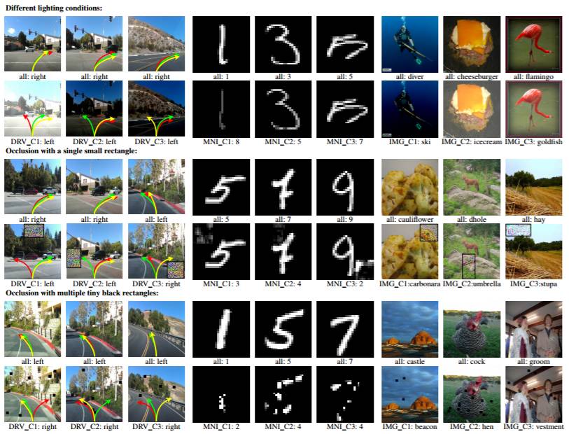 图 7:奇数行展示了种子测试输入,偶数行展示了由 DeepXplore 生成的差异诱导测试输入。左边 3 列展示了用于自动驾驶汽车的输入,中间 3 行是用于 MNIST,右边 3 行用于 ImageNet