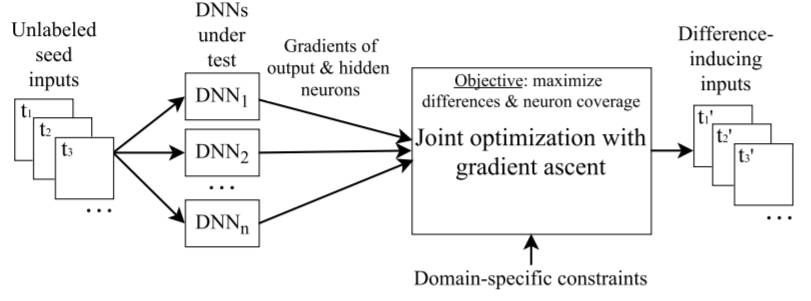 我们给出了寻找相似深度学习系统之间的大量行为差异的问题,同时最大化神经元覆盖率可以被阐释为一个联合优化问题。我们提出了一种基于梯度的算法来有效地解决这种问题。