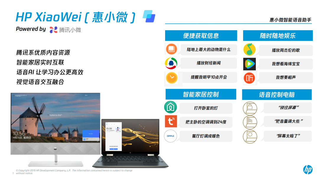 “惠普一直相信,科技创新可以让人们畅享更便捷更舒适更美好的生活,我们携手英特尔、腾讯推出搭载小微平台的业界全新AI智能语音电脑,致力于通过创造、革新,让世界变的令人耳目一新。”