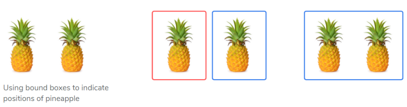 上图中是另一种标注数据的方式,单独或组合标注。例如,如果数据科学家 1 单独标注菠萝,而数据科学家 2 将其组合标注,则两者标注的数据不兼容,导致学习算法变得混乱。因此,需要将数据标签保持一致;如果需要单独标注,请确保所有标注都以相同的方式进行。