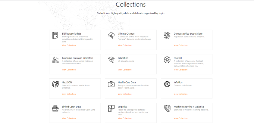 其次是 Datahub.io:Datahub 是一个主要专注于商业和金融的数据集平台。许多数据集,例如国家、人口和地理边界列表,目前在 DataHub 上可用。