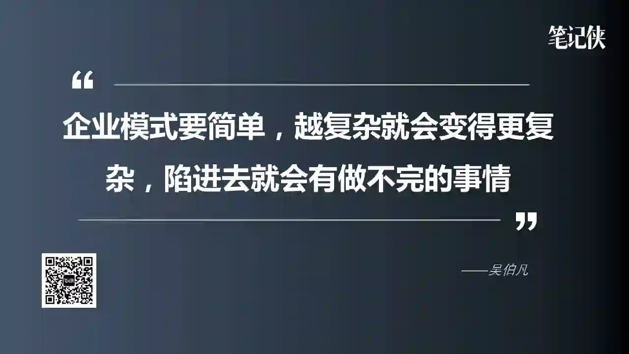 反求诸己、恪守边界,这两种方式会令人变得简单,然而简单才是最有效的处理方式。企业模式要简单,越复杂就会变得更复杂,陷进去就会有做不完的事情。