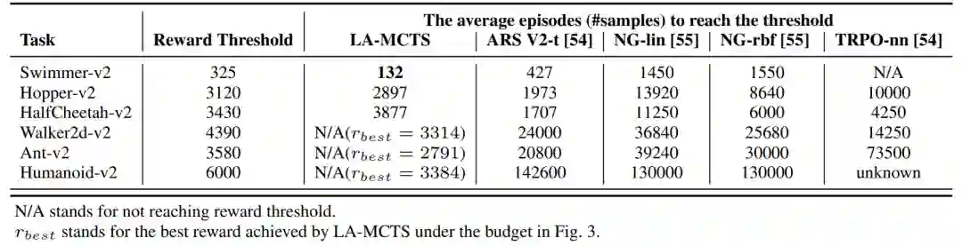 通过这个方式,特别对于高维问题达到同样性能,我们发现LaMCTS可以达到更低的样本复杂度。这里我们在Mujoco的任务上做了测试,和各种已有的黑盒算法进行了比较,蓝线是我们的方法: