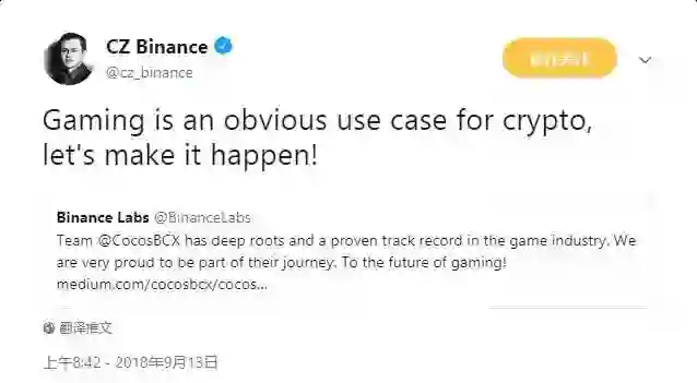 今年9月中旬,Cocos-BCX宣布完成4000万美元融资,币安孵化器Binance Labs、NEO Global Capital和500 Startups等投资机构参与了投资。币安创始人兼CEO赵长鹏曾发推特高调支持这笔投资,他写道:「游戏显然是加密世界的一个用例。让我们去实现它!」