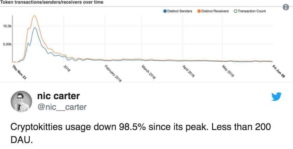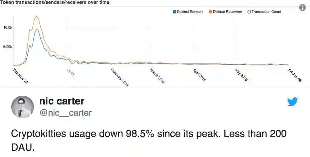 CryptoKitties的用户日活量已急剧下降,从日活近1.5万的高点跌落至不足200