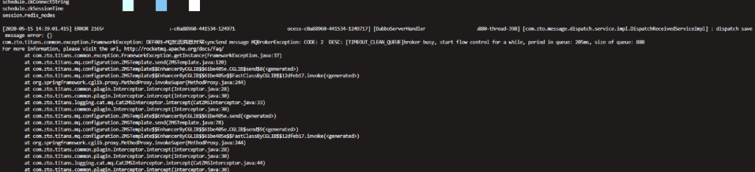 错误信息关键点:MQBrokerException:CODE:2DESC:[TIMEOUT_CLEAN_QUEUE]broker busy,start flow control for a while,period in queue:205ms,size of queue:880。