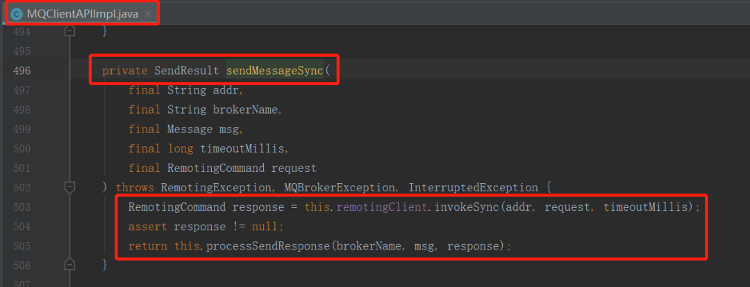 MQClient 消息发送端首先会利用网络通道将请求发送到 Broker,然后接收到请求结果后并调用 ProcessSendResponse 方法对响应结果进行解析,如下图所示: