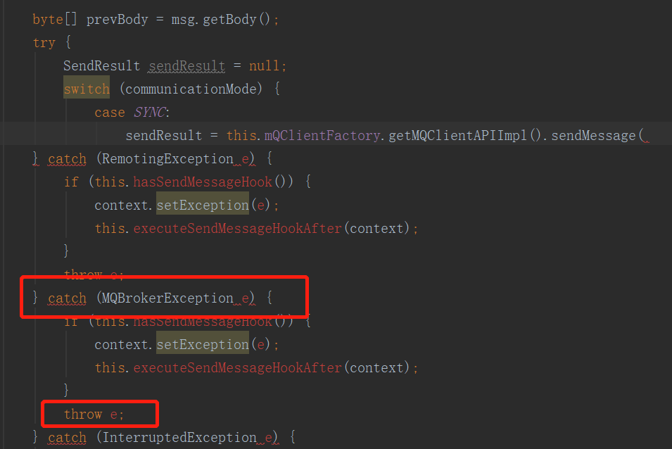 可以看出在SendKernelImpl方法中首先会捕捉异常,先执行注册的钩子函数,即就算执行失败,对应的消息发送后置钩子函数也会执行,然后再原封不动的将该异常向上抛出。