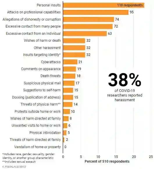 接受调查的新冠研究人员中,38%的人表示,受到过来自新冠研究的骚扰。
