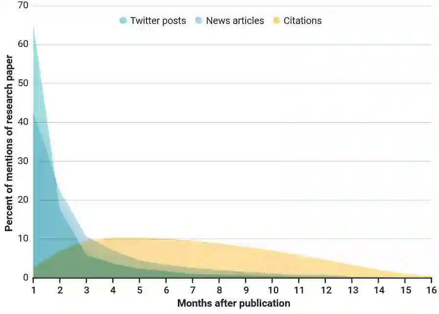 推特、新闻报道、与论文引用中提到相关研究的活跃度与速度
