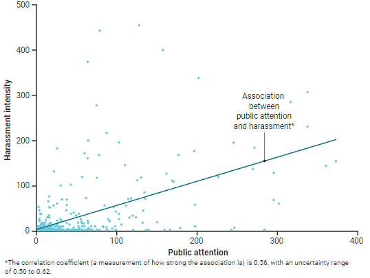 研究人员受的关注度越高,受到的骚扰量也越大,对研究人员的关注往往来自社交媒体、新闻报道以及他们的政策顾问身份。