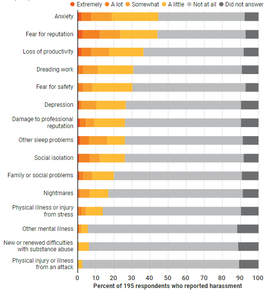 骚扰给研究人员的生活造成了严重影响,导致焦虑、声誉担忧、研究减少等情况出现。