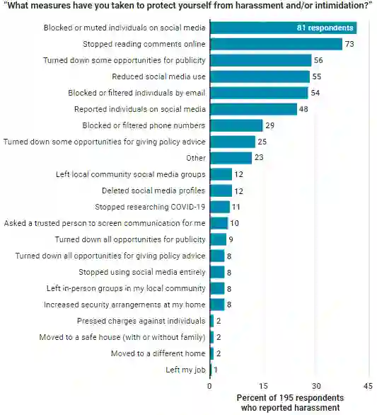 在针对「你采取了什么措施来保护自己免受骚扰和/或恐吓?」这一具体问题的调查中,受访研究人员采取:在社交媒体上屏蔽他人、删除账号、拒绝公开宣传等自我保护措施,以避免骚扰和抵制骚扰。