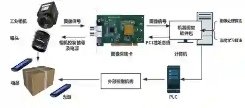 工业机器视觉系统构架主要分为硬件设备和软件算法两部分,其中硬件设备主要包括光源系统、镜头、摄像机、图像采集卡和视觉处理器;软件包中核心算法主要包括传统的数字图像处理算法和基于深度学习的图像处理算法。