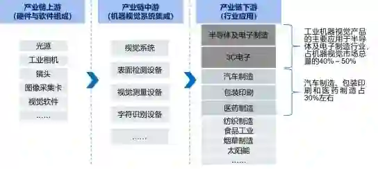 机器视觉系统主要用于完成定位、识别、检测、测量等任务,其使用可以提升生产线的检测精度、自动化水平、柔性化能力,同时降低人工成本、保证工人人身安全。目前机器视觉在半导体及3C电子制造、汽车制造、包装等行业已有广泛应用,也逐步拓展到医药制造、食品加工、纺织制造等领域。虽然其使用仍收到环境光源、核心硬件设备性能、设备端计算资源、检测对象多样性、方案经济性方面的限制,其技术上的不断革新,以及更多先进制造行业对高精度、高效率、高灵活性制造工艺的需求,仍会加速机器视觉进一步的拓展应用。