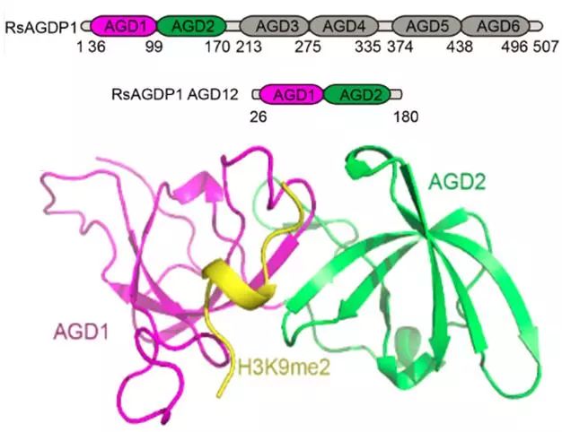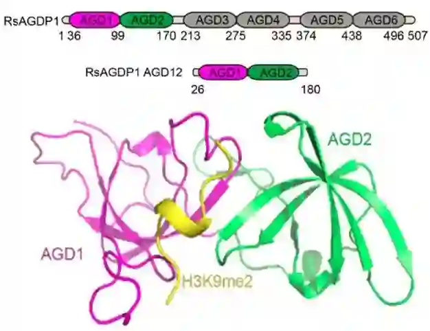 为了寻找新的H3K9甲基化标记的阅读器,该项工作的研究人员用质谱的方法检测花细胞核提取物,发现了一个未知蛋白含有AGD结构域,并将其命名为AGDP1(Agenet domain-containing protein1)。生化结果显示AGDO1可以特异性结合H3K9me2标记。继而,研究人员又解析了AGDP1的AGD12结构域和H3K9me2小肽的复合物晶体结构。从整体的结构中可以看到,AGD12结构域对H3K4以及H3K9me2分别进行特异性的识别。