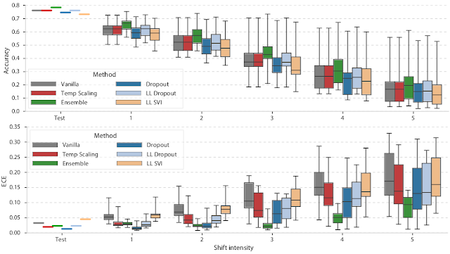 我们将这些损坏的图像用作偏移数据示例,并检查深度学习模型在损坏强度增加的偏移数据下的预测概率。我们在下方展示了每个损坏级别(包含未损坏的测试数据)产生的精确度和 ECE 的箱线图,其中每个箱型图汇总了 ImageNet-C 中的所有损坏类型。每种颜色代表不同类型的模型:用作基线的“普通”深度神经网络、四种不确定性方法(Dropout、温度标定 (Temperature Scaling) 以及我们的 Last Layer Approach 和一种集成方法)。
