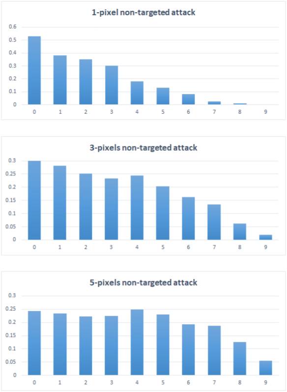使用少数像素扰动能高效地实施非靶向攻击。研究发现仅需要修改 1 个像素,就可将 73.8% 的图像扰动至一个或多个目标类别,在修改 3 个像素和 5 个像素的情况下,比例分别为 82.0% 和 87.3%。这表明不敏感的图像比敏感图像更加稀少,即使扰动已经被限制在这么小的范围内。因为少数像素修改是搜索对抗图像的有效方法,而这种图像在实践中不易被人眼识别。