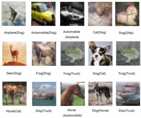 图 1. 使用该研究算法生成的对抗图像成功地在只更改一个像素的情况下误导了目标 DNN。括号内的标签为识别类别,括号外的标签是原类别。修改的像素可能不是很明显,读者需要仔细查看。