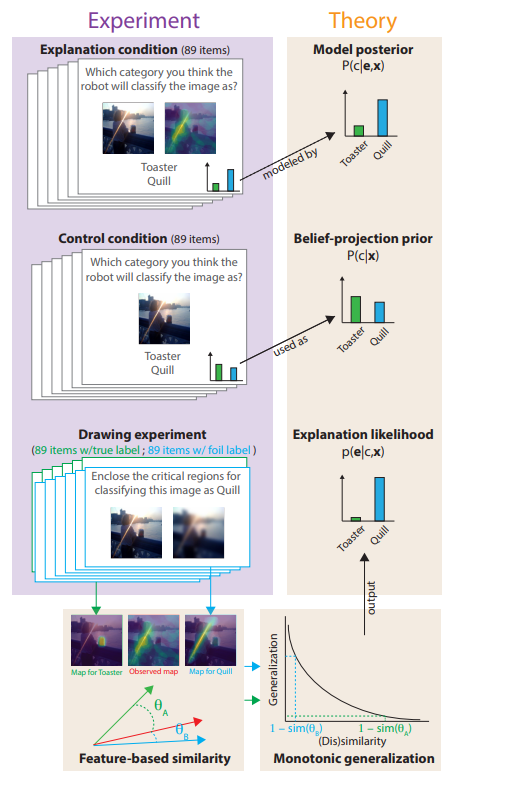 可解释人工智能(XAI)的目标是生成人类可解释的解释,但目前还没有计算精确的理论来解释人类如何解释人工智能生成的解释。理论的缺乏意味着XAI的验证必须在个案的基础上进行实证,这阻碍了XAI系统的理论建设。我们提出了一个关于人类如何从显著图(XAI解释的最常见形式)中得出结论的心理学理论,这首次允许在解释的条件下精确预测被解释推理。我们的理论假设,在缺乏解释的情况下,人类期望人工智能做出与自己类似的决定,他们通过与自己给出的解释进行比较来解释一种解释。比较是由认知科学中的经典理论——相似空间中的Shepard普遍概化定律形式化的。一项预先注册的带有显著图解释的AI图像分类用户研究表明,我们的理论在数量上与参与者对AI的预测相匹配。