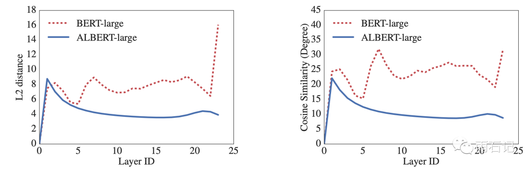 不仅如此,在共享了参数之后,会使得模型更加稳定,这方面的表现就是模型的每层的输入和输出之间的L2距离更小了。如下图所示: