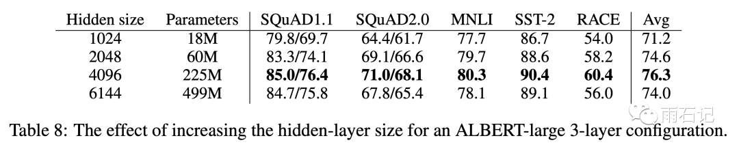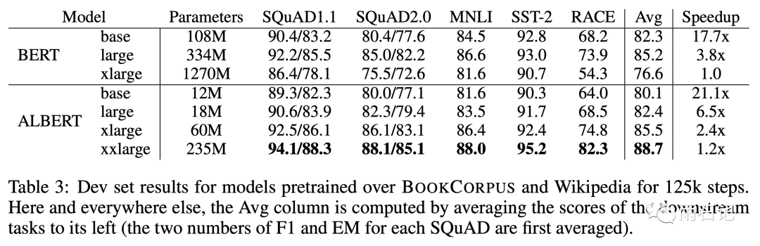 ALBERT和Bert的比较如下图,可以看到,相同的设置,ALBert比Bert略差,但是参数量会减少一个量级。可以看到,达到Bert-large的效果,ALBert-xlarge需要的参数从334M减少到了60M。