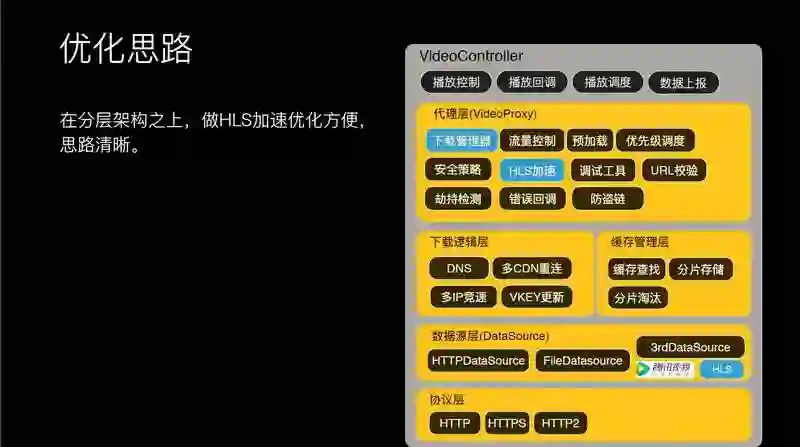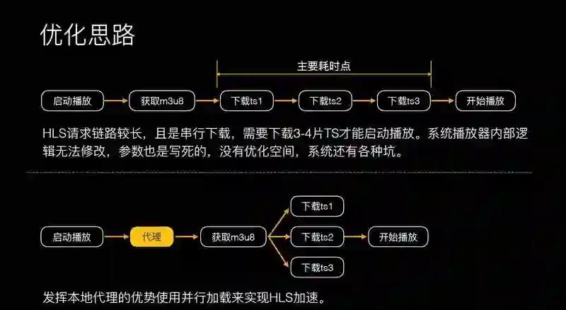 分析发现它的处理也不是很得当,因为安卓系统请求链路较长,串行下载,需要下载 3-4 片 TS 才能启动播放,下载 3 个分片的话,耗时就会很久。之前提到我们这里有代理,有了代理之后做事情方便很多了,通过里获取 M3U8,解析 M3U8 里面有哪些文件,可以做并行下载,只让他下载一次 M3U8,这样下载速度大幅度提升。回到刚才架构上,有了下载代理层的话,你可以做 HLS 的加速和管理,可以加入 HLS 的视频源。