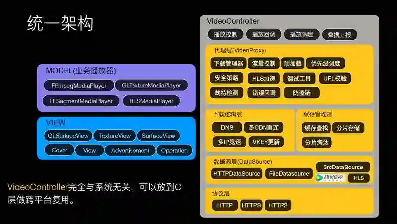 基于 MVC 架构,在 MODEL 一层做一些业务的逻辑,在 VideoController 这一层做控制视频的播放和下载。有了下载代理之后,就可以通过代理管理下载,在 APP 里面有很多的视频请求,VideoProxy 可以管理这些请求,做流量控制,做预加载,还可以做优先级调度和做监控上报,下载逻辑层则主要关注怎么优化服务器,对接缓存管理层,同时我们抽象出了一个数据层,我的数据源可以是 HTTPDataSource,也可以读本地,也可以是来来自腾讯视频的数据源,也可以是第三方 APP 的数据源,协议层主要是 HTTP、HTTPS、HTTP2 的解决。
