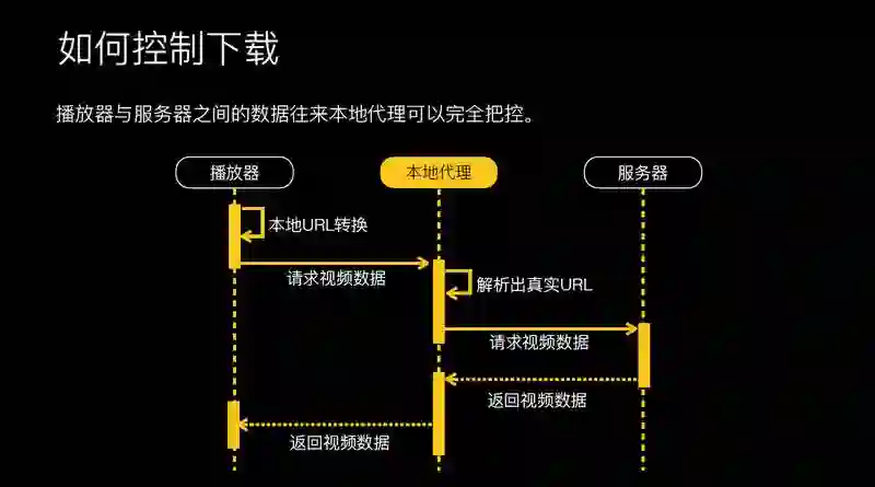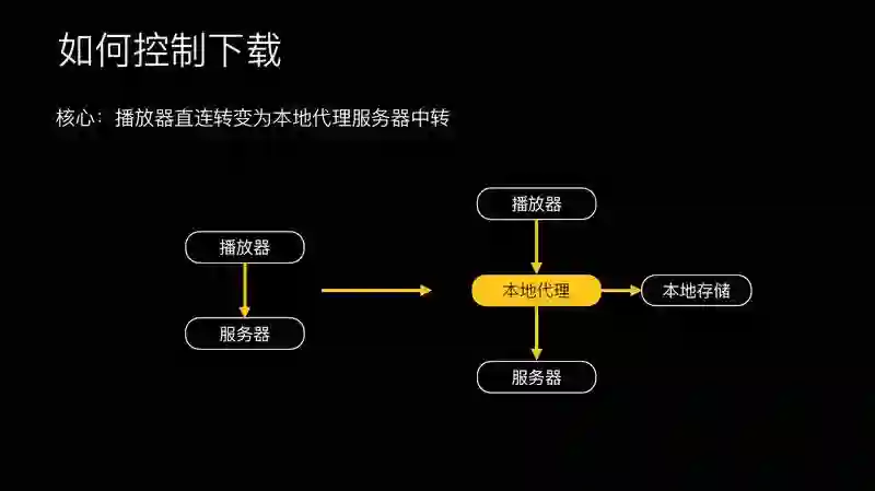 可以看到,完成核心技术要点最核心的一点是如何控制视频的下载,传统的方式是播放器直接塞播放地址给播放器,它就可以直接播放,这其实是一个黑盒。我们在中间加了一个本地代理,播放器与服务器的数据请求,我们完全可以把控。在这个过程中,比如说播放器要数据时,可以给它更多的数据,这样能解决它缓冲的问题。有了这层代理之后,架构也更清晰一点。