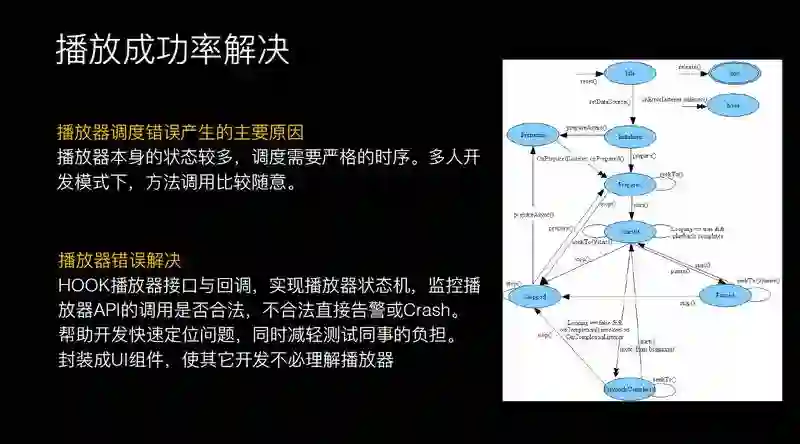 我们解决播放器错误的方法:HOOK 播放器接口与回调,实现播放器状态机,监控插放器 API 的调用是否合法,不合法直接告警或 Crash。帮助开发快速定位问题,同时减轻测试同事的负担,封装成 UI 组件,使其它开发不必理解播放器。