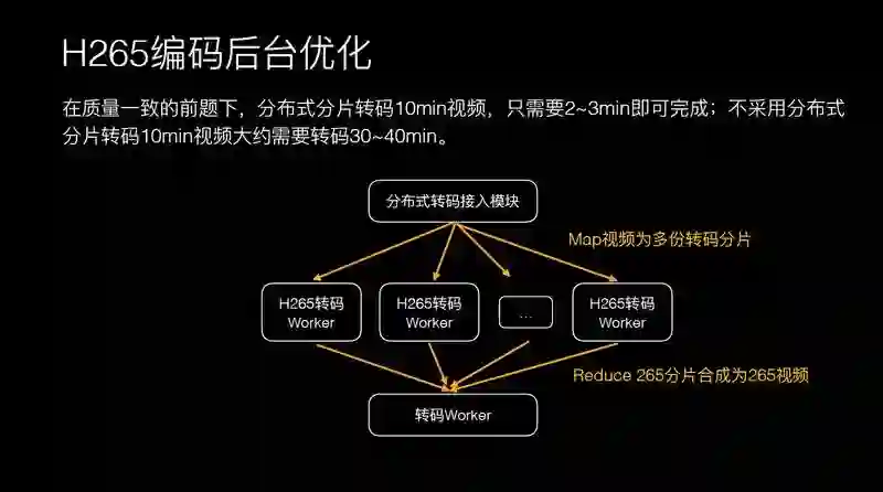 因为热点转瞬即逝,可能前一分钟是热点,后一分钟就不是热点,社交网络的传播非常快,我们给后台的要求是转码速度一定要快。在之前没有优化时,转一个 10 分钟的视频要半个小时左右。后来做了分布式处理之后,转 10 分钟的视频只用 2-3 分钟。一些短视频最长 5 分钟左右,只要监测到视频很热的话,1 分钟之内就能转出来,就是 H.265 了。