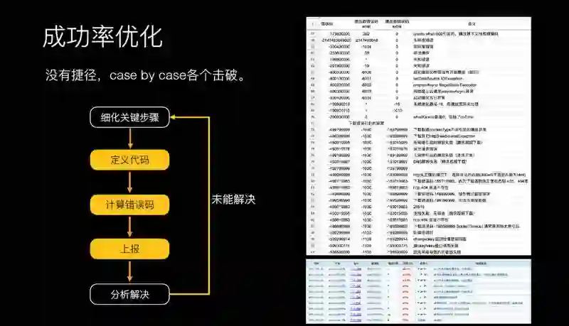 成功率优化,也是比较关键的指标。成功率优化没有捷径,可能是 Case by Case 各个击破。针对错误进行编码,有几百个错误码,每一个错误码捞 log 去看,错误码原因进行上报,每次进行循环一个个错误码进行解决。