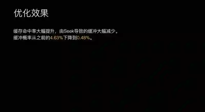 产生卡顿的用户里面,90% 是因为进行拖动,拖动之后又没有缓存数据,所以这里有可能导致缓存。统计效果也是比较明显的,上了分片缓存之后,之前的缓存概率是 4.6% 左右,最后下降到 0.48%,基本上看不到发生缓冲的场景。