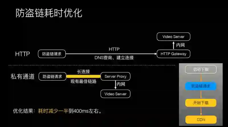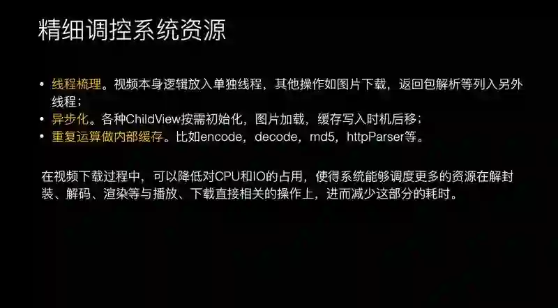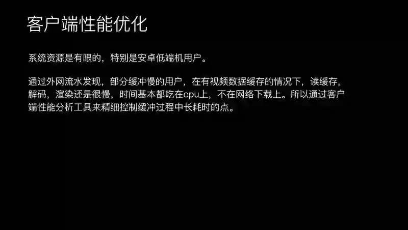 因为视频涉及到的流程比较多,在这个过程中还要更关注客户端的影响,要分析下客户端哪些在抢占视频播放资源,我们之前犯过一些错误,md5 会卡住一些流程,或者是 HttpParser 会阻止你的任务,会导致视频播放更慢。