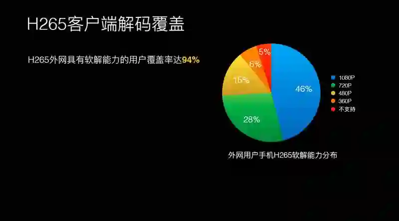 经过我们的统计,外网上有 94% 的手机还是支持 H.265 解码的。支持 1080P 手机的解码占 46%。