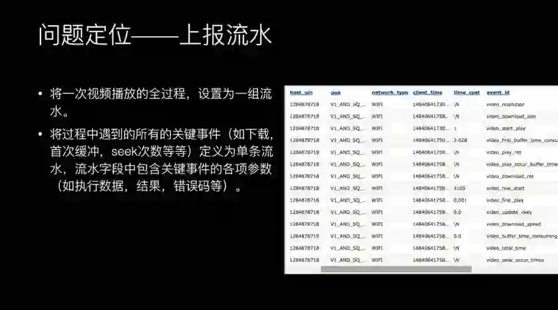 还可以把每次播放视频的链路所有关键流水上报到统计系统里来,每一次播放都是一组流水,每一条流水里面就包含了例如首次缓冲发生的 Seek,或下载的链接是多少,下载的时间是多少,有了这些流水之后,用户反馈播放失败,我首先可以用流水看发生了什么错误?错误在哪一步?每一步信息是什么?几秒钟就可以定位到问题。