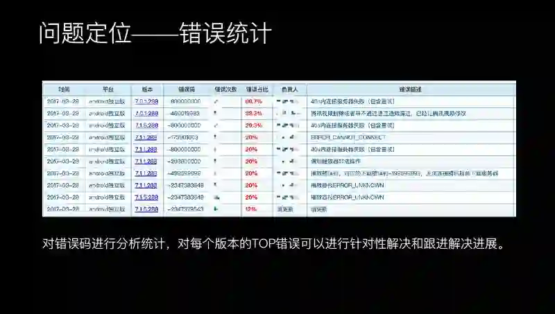 有了这个数据上报之后,还可以做一些报表。比如说可以做错误码的报表,有了报表之后就可以跟进哪个错误是在 TOP 的,负责人是谁,原因是什么,都可以看到。