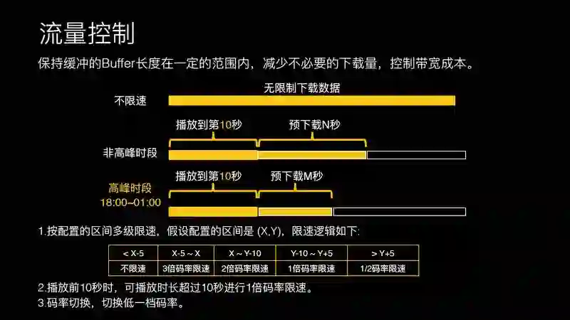 如果之前不做限速的话,一点开视频就疯狂地下数据,带宽有多大就下多少的数据,这样浪费很严重。我们采取的第一个策略是进行流量控制。在高峰期播放到第 10 秒时,预下载 N 秒数据,下载到 N 秒就停下来。然后,可以做多级限速。一开始不限速,下载到合适时机做 1 倍码率限速。高峰期时预加载的数据会少一些,防止高峰期时带宽占用明显,这是初级的策略。最终我们也有码率切换的策略。这对用户的观看体验影响比较大,这也是之前必备的一个策略。