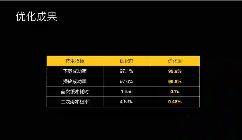 最终优化的成果是这样的,下载成功率优化前是 97.1%,优化后是 99.9%。播放成功率优化前是 97.0%,优化后是 99.9%。首次缓冲耗时优化前是 1.95s,优化后是 0.7s。二次缓冲概率优化前是 4.63%,优化后是 0.48%。数据还是很可观的。