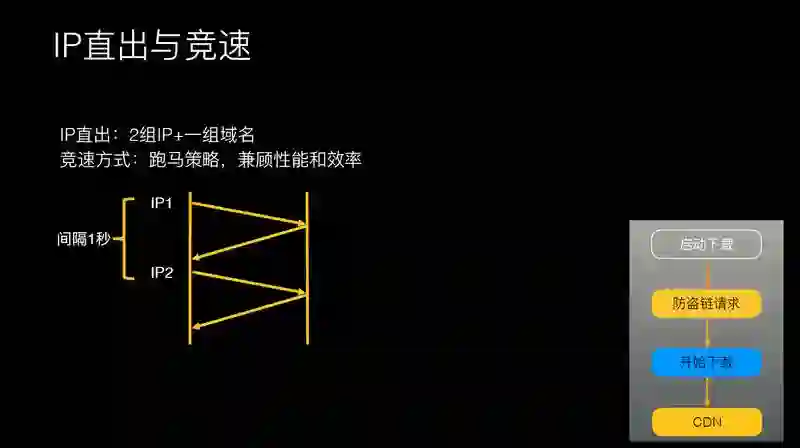 关于优化下载链路,这里也是谈的比较多的,一般也是直接输出 IP 地址,利用 IP 地址做跑马的策略,兼顾性能的效率,这个是用的比较多的方式。