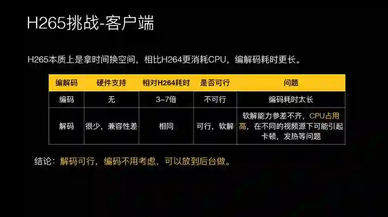 解码的硬件支持 H.265 的也很少,耗时差不多是一样的。解码是可行的,你可以采用软解的方式,这个带来的问题是 CPU 占用非常高,可能之前 H.264 占 20% 的 CPU,H.265 占 70%、80% 左右,带来的问题是发热和耗电。